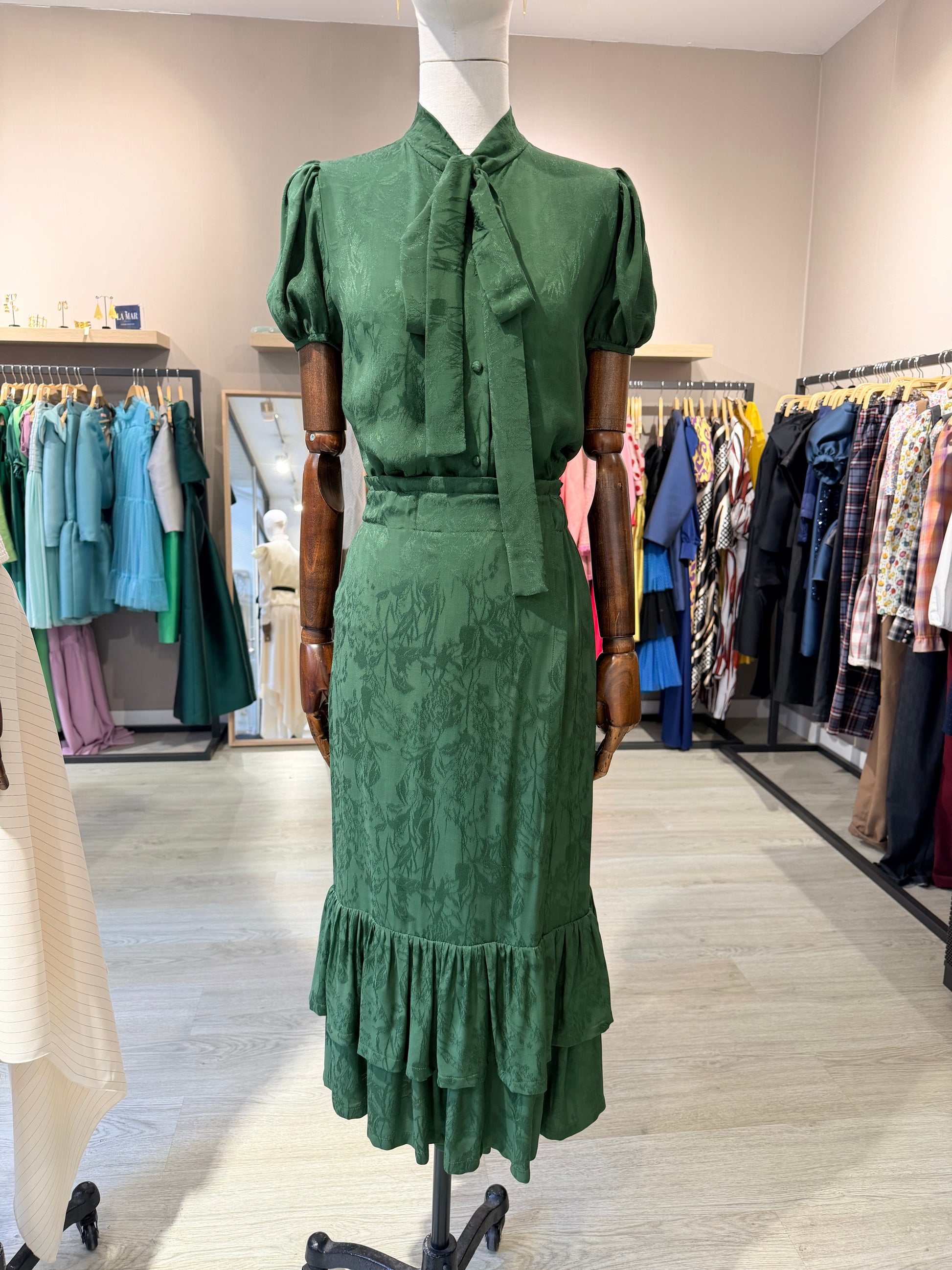Blusa fluida manga corta con lazada en el cuello, botón forrado realizado en jacqard verde kaki intenso. Lleva detalle nervios en la espalda. Diseñada y confeccionada en España.