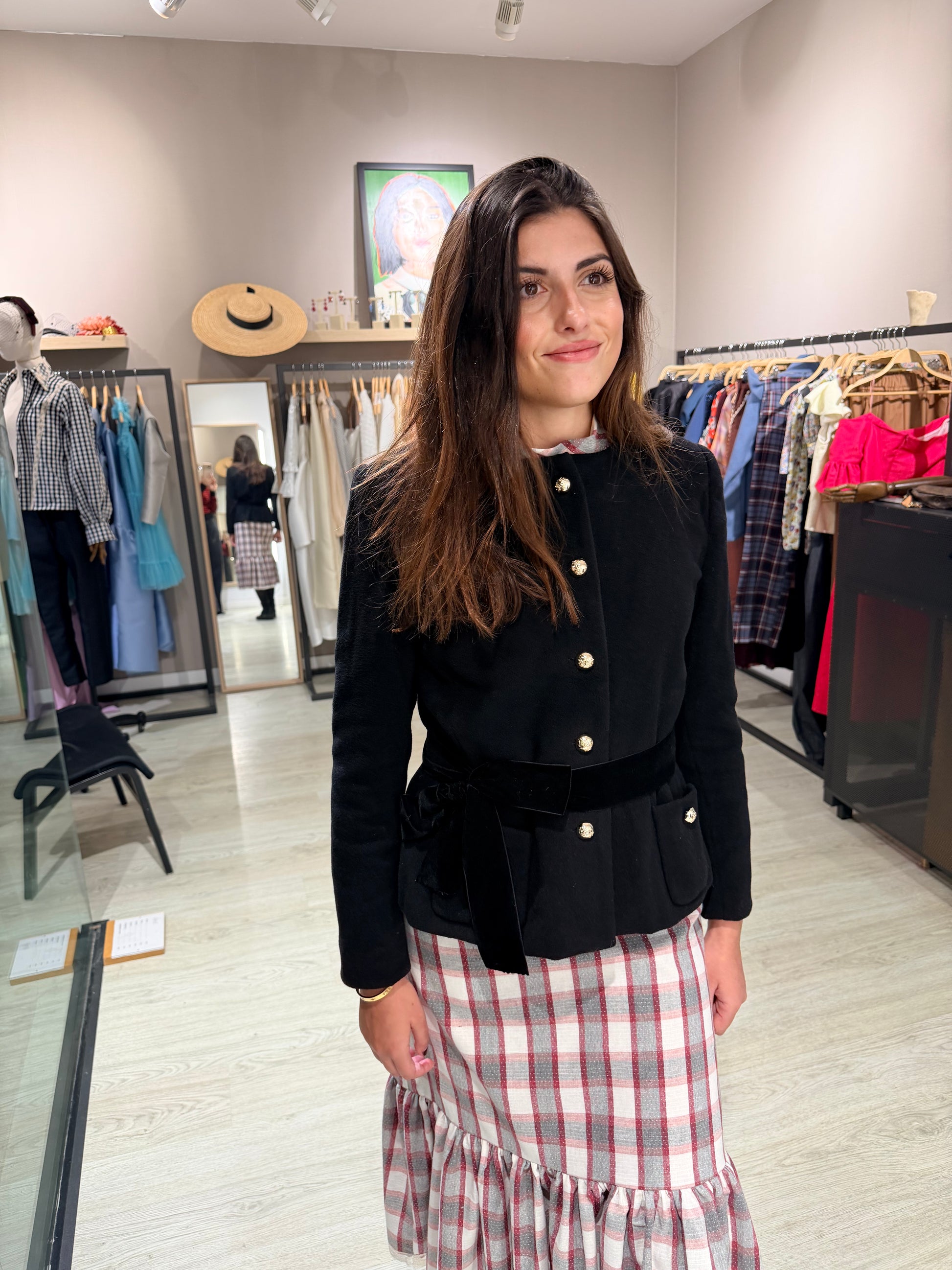 Chaqueta entallada con bolsillos, escote caja, confeccionada en paño de lana y cashmere, con botón metálico dorado claro y cinturón de terciopelo se puede usar tambien sin cinturón. Sienta como un guante y abriga. Esta Prenda, confeccionada en materiales nobles, está pensada para formar parte de tu armario cápsula. Disponible a medida, consulta las condiciones.