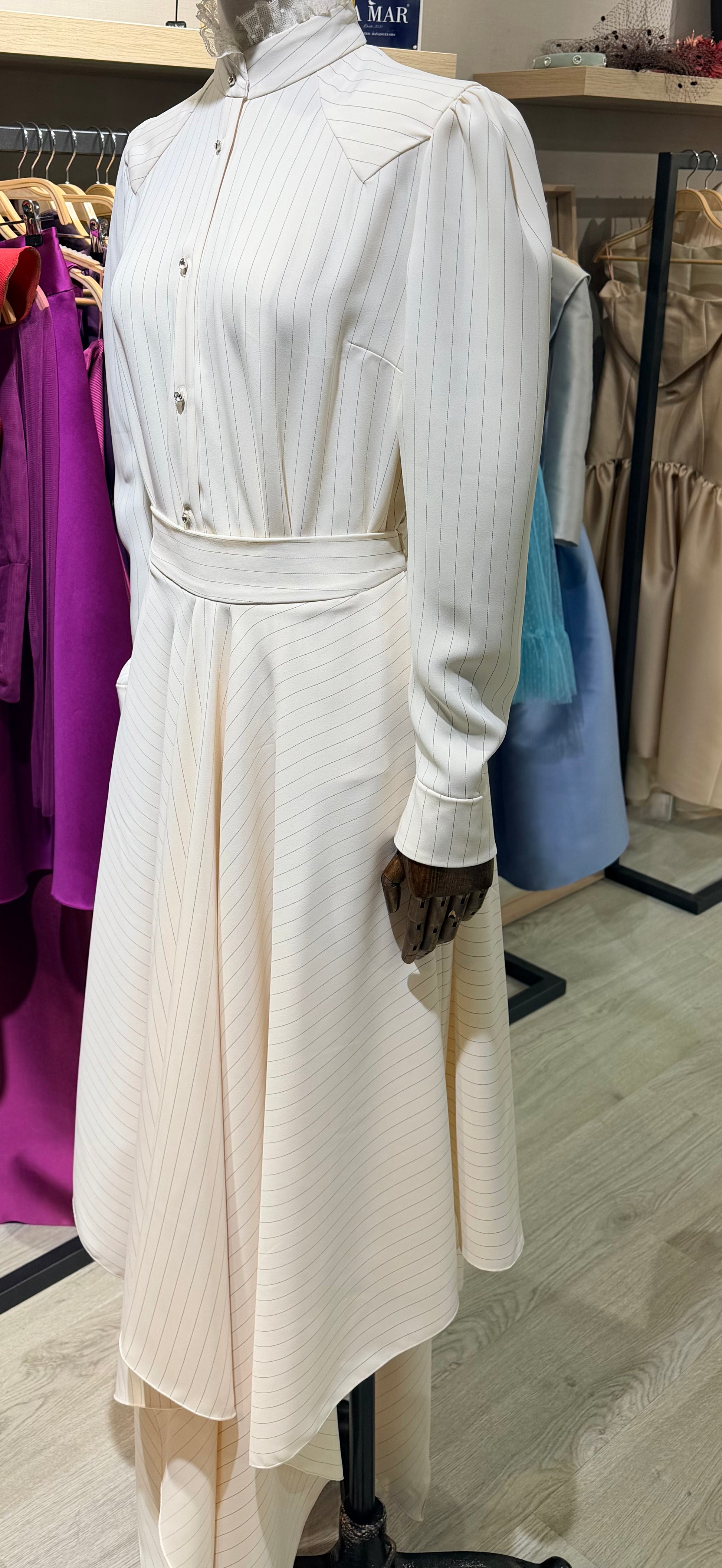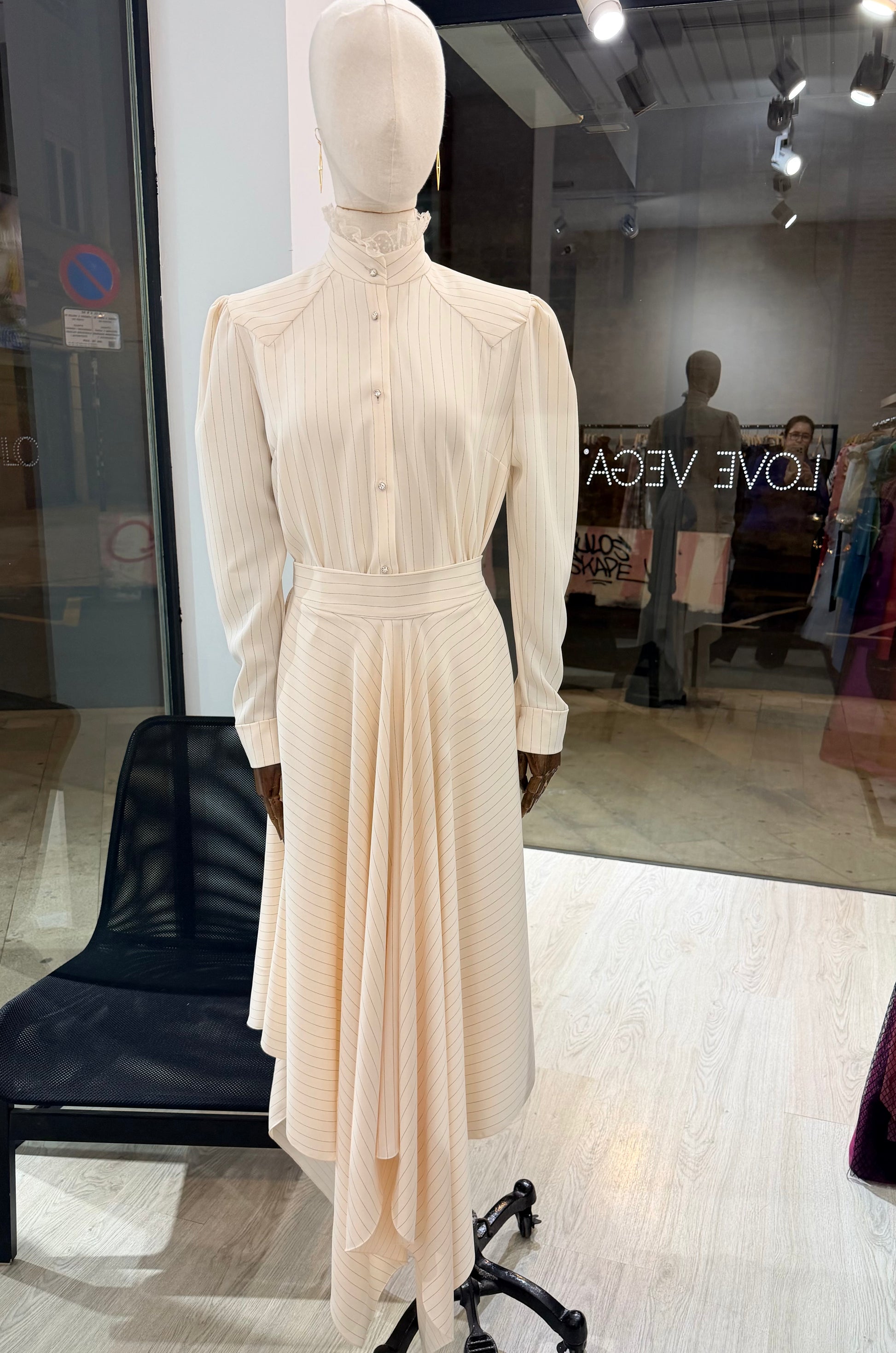Falda corte en capa más corta en los laterales y con pliegues en los costados, cinturilla curvada. Realizada en raya diplomática. Diseñado y confeccionado en Valencia.