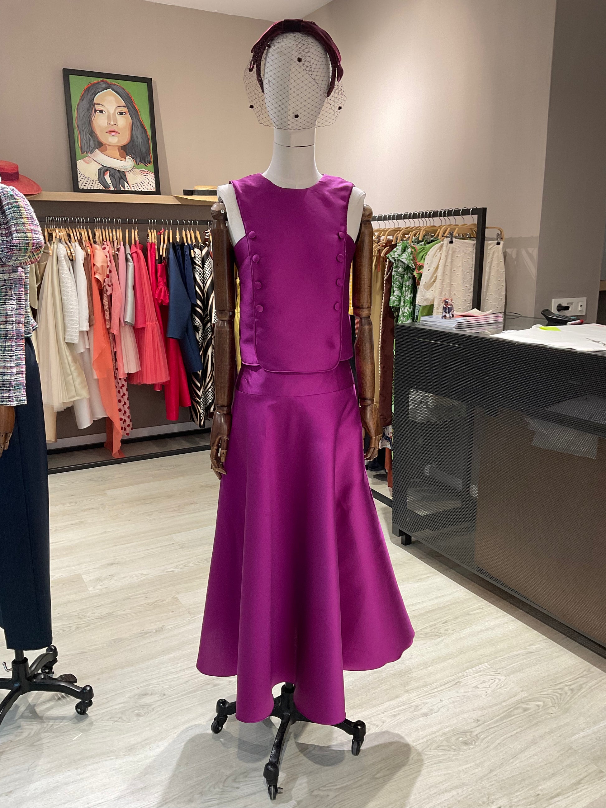 Top entallado sin mangas, botones forrados, y corte en pechera. Escote caja y sisas en ángulo recto. Confeccionado en mikado buganvilla. Cremallera lateral invisible.