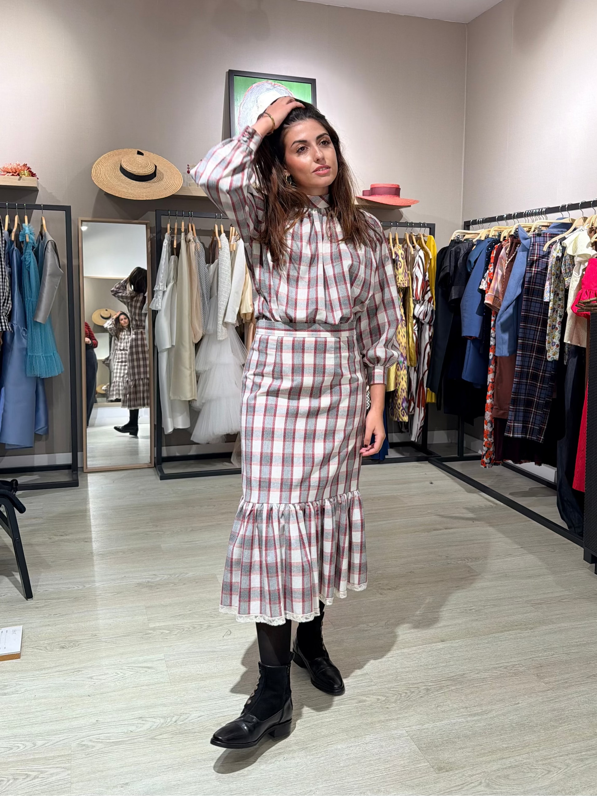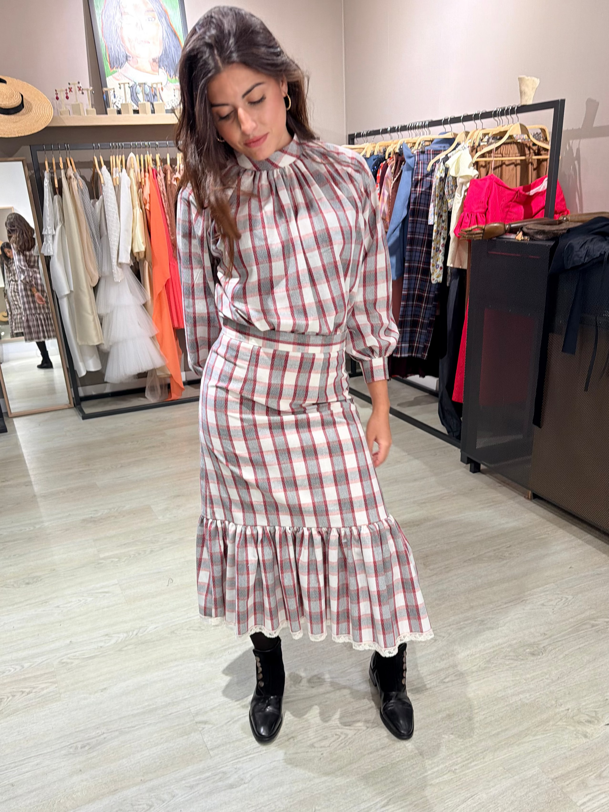 Falda realizada en cuadros de algodón en color gris, burdeos y blanco roto. Con volante rematado en encaje de Valencienes crudo, cremallera invisible en el costado. Corte de la falda ligeramente evasé. La puedes combinar con el top del mismo tejido o con casi cualquier prenda de tu armario.