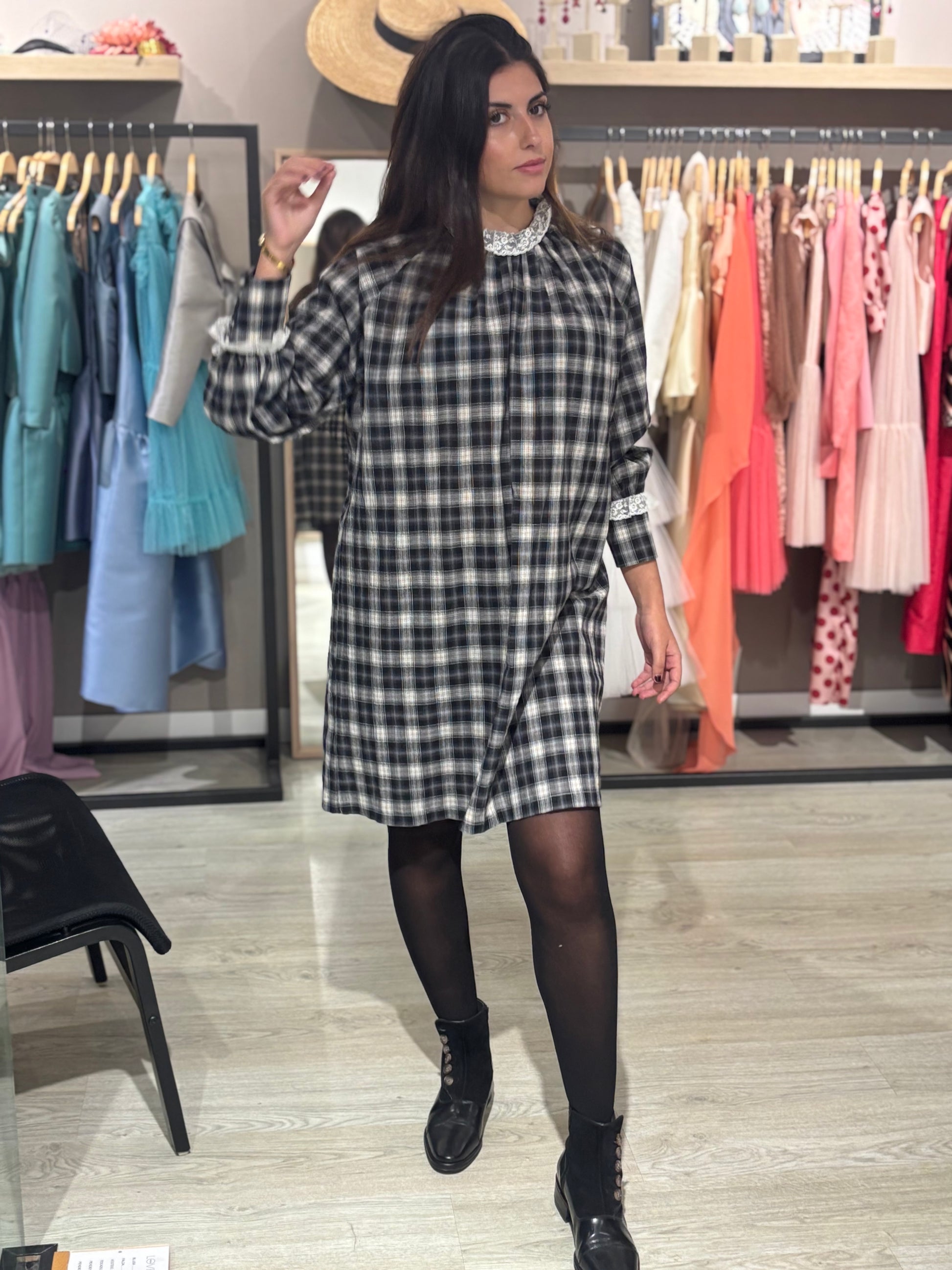 Ligeramente holgado en cuadros gris, negro y blanco roto. Adornado en cuello y puños con encaje de valencienes y botón forrado. largo rodilla puede ponerse un cinturón acortando el resultado. 100% algodón. diseñado y hecho en Comunidad Valenciana España.
